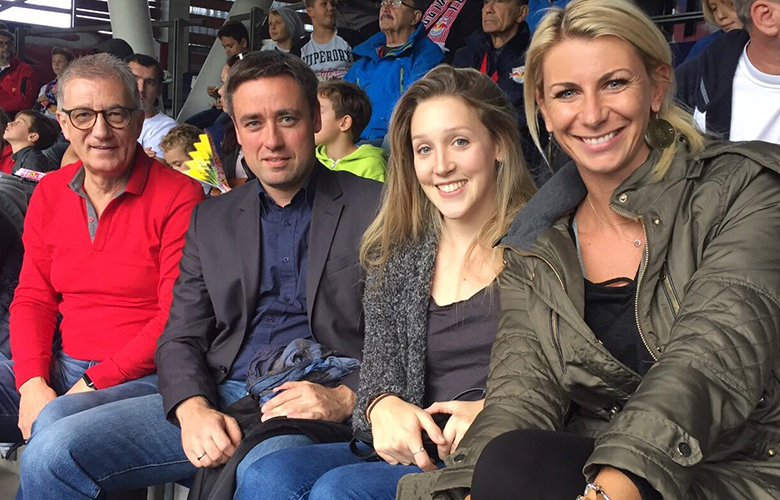Walter Steidl (li.), Wolfgang Gallei (kaufm. Geschäftsführer KOKO) und zwei Betreuerinnen von KOKO beim Stadionbesuch.